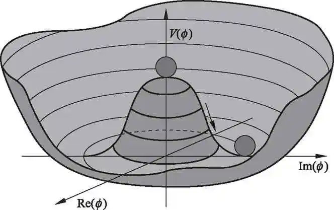 撇開復雜的數學運算,通常的物理教材都用圖3來講解希格斯機制。這裏要引進一個標量場(自旋0) 粒子,它的勢就如圖3中所示的啤酒瓶底形狀。這樣的勢使得粒子場值等於零(中心點)處不穩定,而真空會跑到邊上勢值最低點位置。這樣真空對稱性就自發破缺了,規範粒子吃掉歌德斯通粒子**[20****]**(無質量的玻色子) 獲得了質量。費米子也可以由其與標量粒子的耦合產生質量。該標量場在真空點處激發會產生一個自旋為零的粒子,就是所謂的希格斯粒子。這是標準模型理論重要的理論基礎。這種獲得質量的方式有時也被稱為真空凝聚。