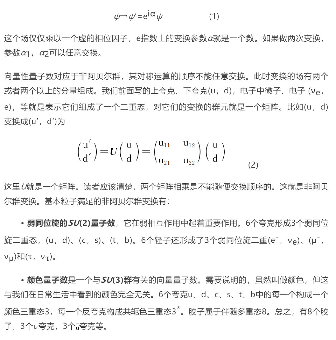 內部對稱性,或者粒子具有的內稟屬性比較複雜,所以這裏還需要對對稱性在量子力學及場論中的應用做一些説明。對稱性在數學的分支理論羣論中得到了系統的研究。對稱性是由羣指定的,它告訴我們量子數守恆,以及如何將它們相加。可疊加的量子數通常對應於U(1)羣。電荷就是一種U(1)對稱性,基本粒子中還有超荷也具有U(1)對稱性。U(1)羣是一個所謂的阿貝爾羣,這意味着對稱變換的順序是不重要的。比如一個場ψ變換為