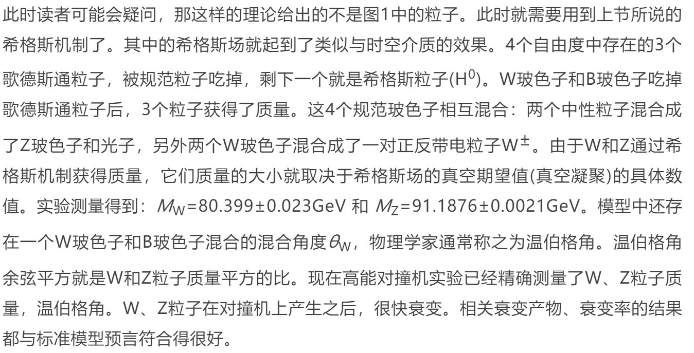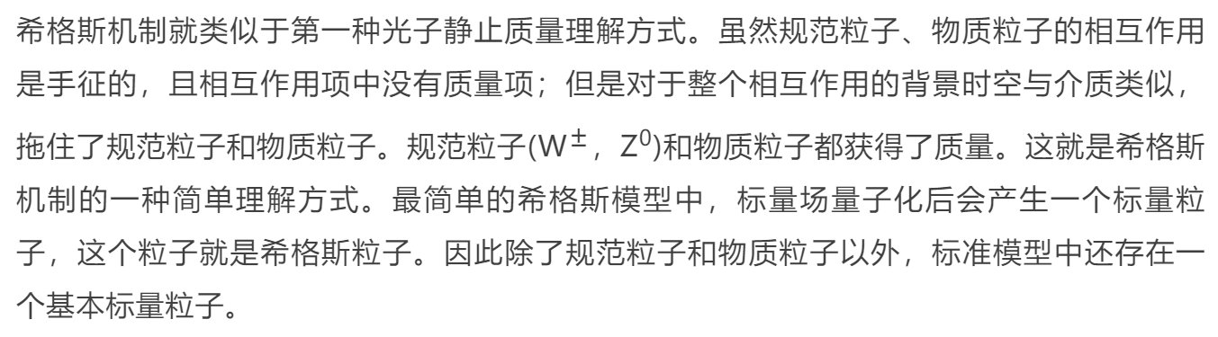 這些分立對稱性對應的量子數也是構建粒子物理標準模型需要遵循的原則。既然弱相互作用下粒子宇稱不守恆,那相互作用的模型就是一個手徵理論。所謂手徵理論説的就是模型中左手和右手粒子的相互作用是不一樣的。換一種説法,在上面講的楊-米爾斯理論中,如果左右手粒子相互作用不一樣,那模型就沒有質量項。而通常的基本粒子很多都是有靜止質量的。不僅如此,還存在另外一個問題。為什麼強相互作用和弱相互作用力程很短?現在我們知道弱相互作用力程很短是因為傳播弱相互作用的規範玻色子質量很大,而楊-米爾斯理論中規範粒子也不能寫下質量項,那怎麼才能構建一個合理的模型呢?這時候就輪到希格斯機制出場了。