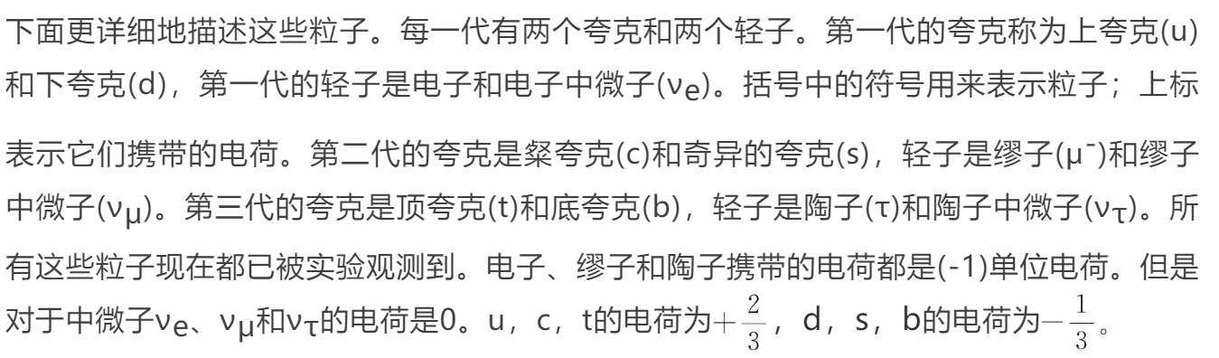 正如前言所述,我們將略過20世紀後半葉的歷史,直接跳到我們今天所知道的物質基本成分的總結上。物質的成分可分為兩類:夸克和輕子。它們是不同的,因為夸克參與強相互作用而輕子則沒有。夸克和輕子有三代。不同代的組分間除了質量以外,沒有任何差別。第一代組分組成了我們常見的物質。第二代和第三代的成分不穩定,在地球上無法自然發現,但它們可以由普通物質的高能碰撞過程產生。最近的實驗表明,可能不會有超過三代的物質。但為什麼是三代?為什麼我們還有第二代和第三代呢?這一點沒人真正知道。1936年,當第二代輕子繆子被發現時**[9****]**,它是如此令人吃驚,以至於物理學家拉比説出了他那句著名的話:“誰預定的這個?”80多年過去了,我們仍然不知道答案。