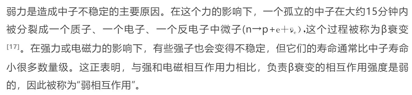 剩下的兩種基本相互作用是在20世紀被發現的。它們是強相互作用和弱相互作用。在日常生活中人類個體是無法體驗到這兩種相互作用的,因為力程非常短。兩個核子之間的強相互作用力只有在它們相距10^-15m以內時才有效**[16****]**;弱力力程更短:約10^-17~10^-18m。太陽發光發熱就是因為其內部發生的核聚變反應釋放的能量。核電站、原子彈及氫彈就是人類可以利用核能的例子。