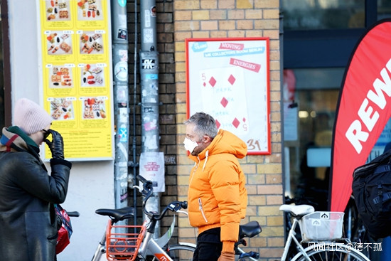 圖為一位購物者佩戴口罩步出柏林市中心的大型超市。(圖片來源:中新社)