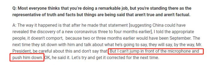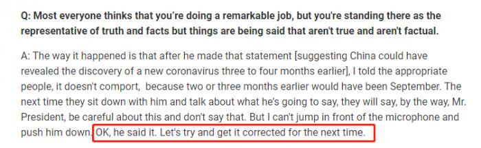 福奇表示,在特朗普發表那份聲明(暗示中國可能在3到4個月前就發現了這種新型冠狀病毒)之後,他告訴相關人士,這樣不妥,因為(這麼算)兩三個月前可能就是9月了。等到下次他們坐下來與他(特朗普)討論他將要説什麼時,他們會説,順便提一句,總統先生,小心點,不要這麼説。但我總不能跳到麥克風前面把他推下去。好吧,他還是説了。(只能)讓我們試着下次再糾正過來了。