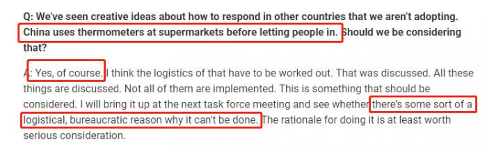 福奇還在採訪中對中國的一些防疫措施表示認可。在被《科學》雜誌問到美國是否應該效仿中國在超市門口進行體温測量的舉措時,福西表示“是,我們當然應該考慮”。他還表示,他會在下一次疫情工作組的會議上把這件事提出來,看看是什麼後勤或官僚主義的原因導致美國現在沒有實行這種很值得考慮的措施。