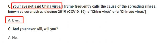 接着,在被記者問到“您沒有説過‘中國病毒’”時,福奇回答説:“永遠(不用)。”記者補充:“您永遠不會這麼説,是嗎?”福奇回答:“是的。”