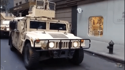 ▲裝備M240通用機槍和M2HB重機槍的美國民警衞隊悍馬車隊開入曼哈頓