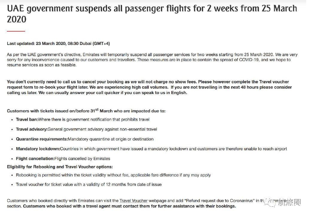 阿聯酋官方宣佈,自3月25日起,暫停除貨運與緊急飛行外的所有客運航班。受此影響,阿聯酋航空自3月25日起暫停兩週內所有客運航班。阿聯酋航空為受影響旅客提供免費改簽以及退旅行券的選項。