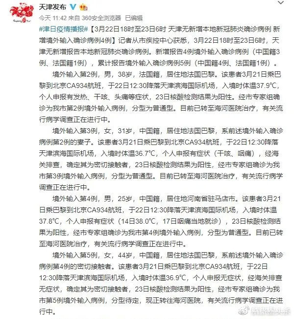 今天,天津市通報3月22日18時至23日6時新增4例境外輸入確診病例(中國籍3例、法國籍1例),均為3月21日巴黎-北京CA934航班旅客,該航班為北京分流至天津的第二個國際航班。