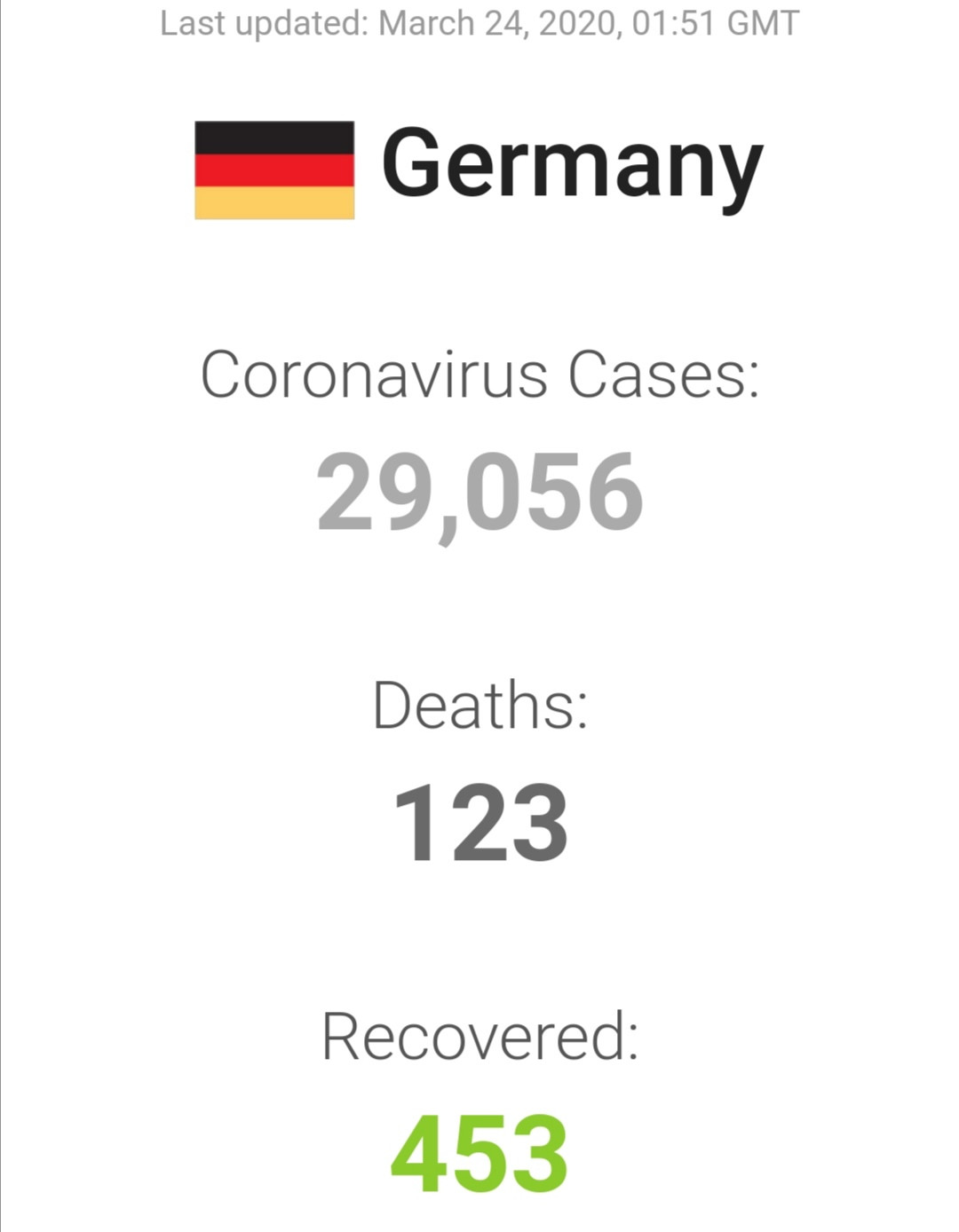 截至23日,德國新冠病毒感染人數已達到27944人,北威州感染人數約佔全德總數的三成。海因斯貝格縣是北威州新冠病毒的最初爆發地,也是疫情最為嚴重的郡縣,該地區感染病例超過1000例,累計死亡21例。