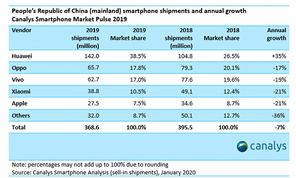 在國內市場中,華為以38.5%的市場份額佔據頭把交椅,是第二名、第三名市場份額的總和還多。並且在2019年全球手機市場衰退的大潮中逆勢增長,華為國內市場出貨量同比增長達到35.5%。