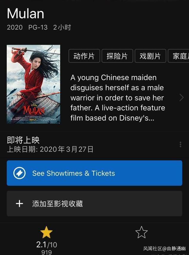 還有一些人跑到了外網,開始給《花木蘭》惡評和刷低分。短短几天時間,這部還沒有上映的電影,竟然就被刷到了2.1分的低分…