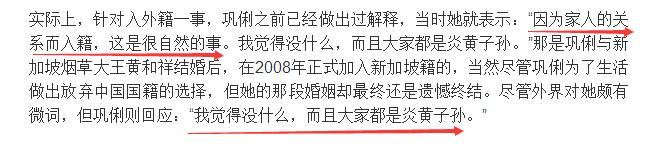 “鞏皇”如今也已經不是中國籍了,與新加坡煙草大王黃和祥結婚後,她於2008年正式加入新加坡籍。