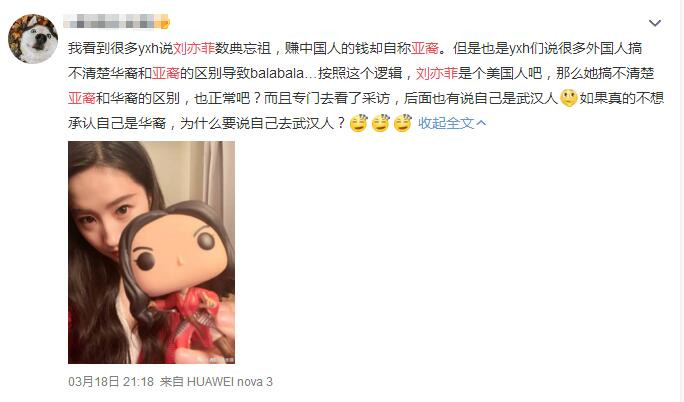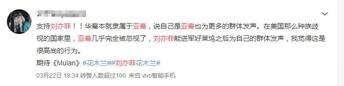 還有人稱,華裔本身就屬於亞裔。覺得在美國這麼種族歧視的國家裏,亞裔幾乎完全被忽視了,劉亦菲能在進軍好萊塢之後為自己的羣體發聲,是很高尚的行為。