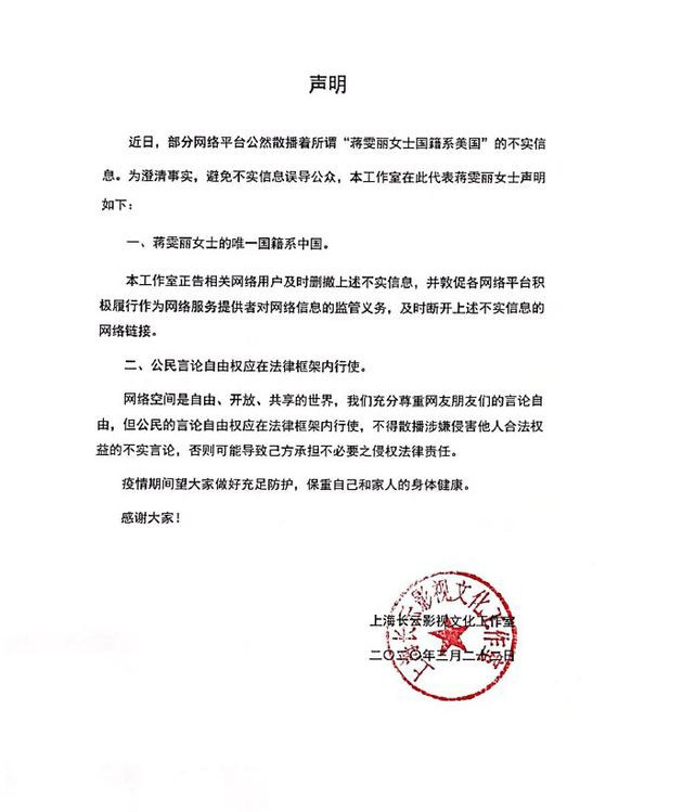 蔣雯麗則回應稱,“蔣雯麗女士國籍系美國”為不實消息,蔣雯麗女士的唯一國籍系中國,公民言論自由權應在法律框架內行使。