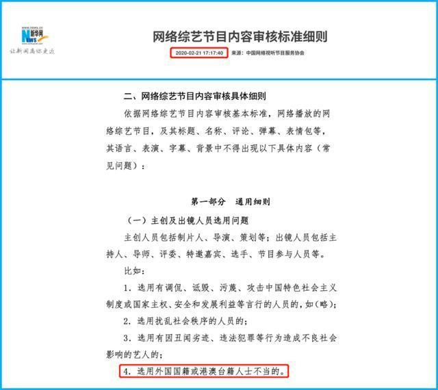 但其實,細則中提到,網絡播放的綜藝節目,及其標題、名稱、評論、彈幕、表情包等,其語言、表演、字幕、背景中,不得出現以下具體內容,其中包含“選用外國國籍或港澳台籍人士不當的”。