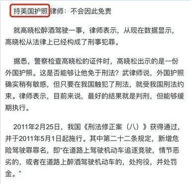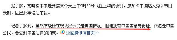 隨後,據法制晚報報道,高曉松雖然現場出示的是美國護照,但他擁有中國籍身份證,依然是中國公民,會受到中國法律的約束。