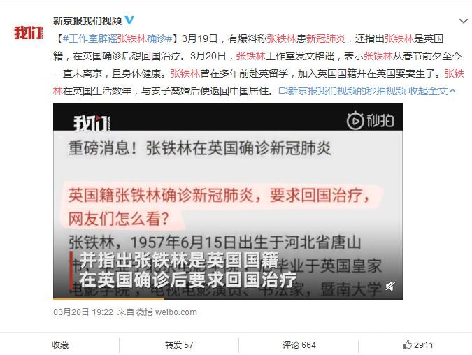 就在上週,張鐵林被傳在英國確診新冠肺炎後,想回國治療。隨後,張鐵林工作室發文闢謠,稱張鐵林從春節前夕至今一直未離京,且身體健康。