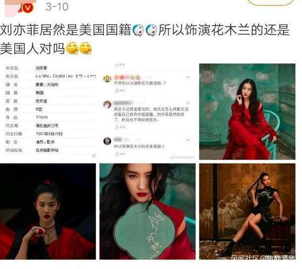 比如最近因為《花木蘭》備受矚目的劉亦菲,被網友們發現竟然是美國國籍。