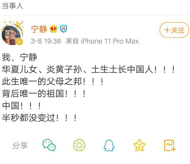 之後,她發文怒懟,稱自己是土生土長的中國人,唯一的祖國就是中國,半秒沒變過。