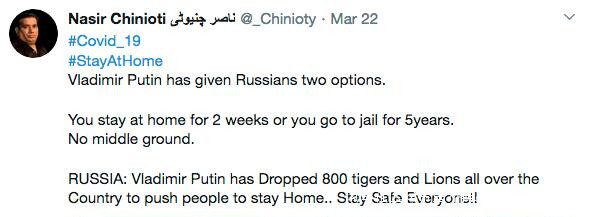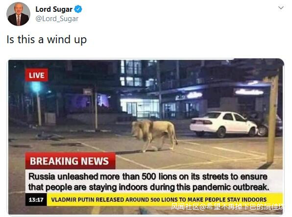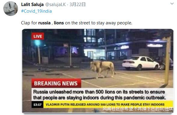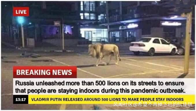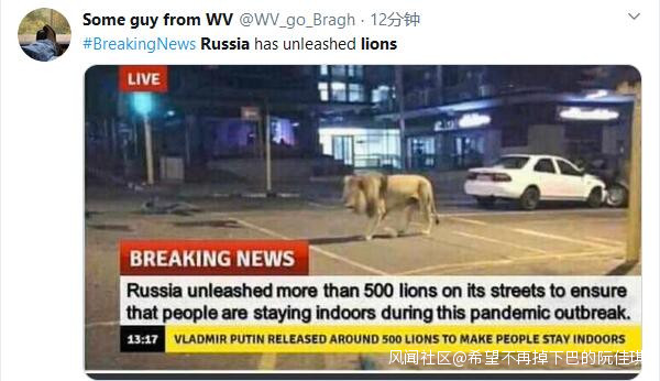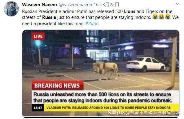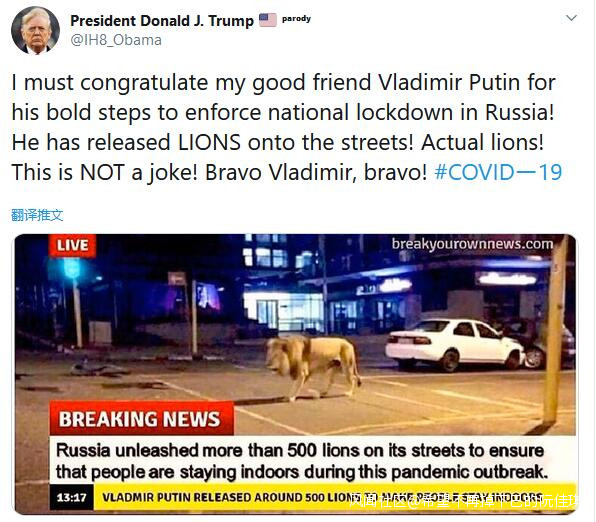 一個冒充特朗普的高仿社交賬號立刻就這個虛假信息開始了“加戲”操作:“我必須祝賀我的好朋友普京,他採取了大膽的措施用以加強俄羅斯的國家封鎖!他把獅子放到了街上!真正的獅子!這不是開玩笑!普京萬歲!#COVIDー19。”