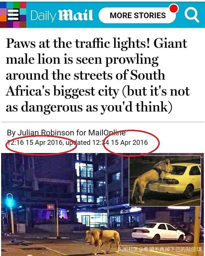 實際上這則“突發新聞”的獅子原圖拍攝於2016年,據每日郵報報道,當時有一個攝製組在南非約翰內斯堡拍攝節目,從附近的獅子公園借來了圖中的“哥倫布”,在被柵欄圍住的區域內進行拍攝。