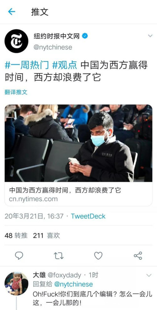 華盛頓郵報,寫中國的疫情爆發再次證明中國人是東亞病夫;一向自詡客觀公正的紐約時報,充斥着**“新冠病毒危機暴露中國治理體系失敗”“肺炎疫情令‘大國崛起’敍事黯然失色”**之類的標題。所以才有了那個梗:中國封城,紐約時報説“侵犯自由和人權”,意大利封城,就是“英雄和犧牲的精神”。