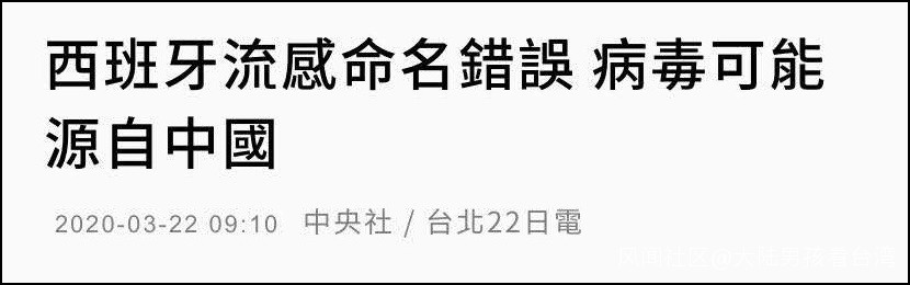 3月22日,過去長期被認為是台灣地區最具權威性的媒體“中央社”發表了一篇報道,題為《西班牙流感命名錯誤 病毒可能源自中國》。