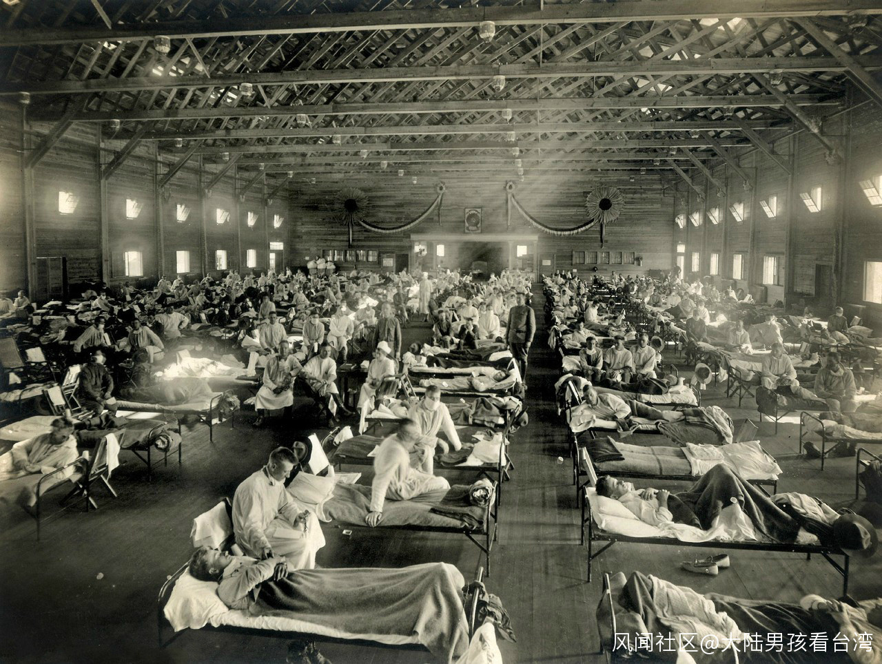**現在學術界更為公認的事實是,西班牙流感應當是起源於美國。**因為現存最早的西班牙流感病毒樣本之一,便取自一名美國士兵的遺骸,他於1918年5月11日在堪薩斯州的一座軍營內病逝。而其他學者的統計更是表明,到1917年底,至少14個美國軍營中已經發生了第一波流行病。