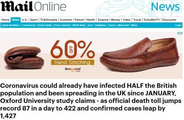 《每日郵報》報道截圖 報道稱,牛津大學的最新建模研究顯示,1月中旬,新冠病毒已經開始在英國傳播,這個時間大約是英國報告第一例確診病例的兩週前、報告第一例死亡病例的一個月前。