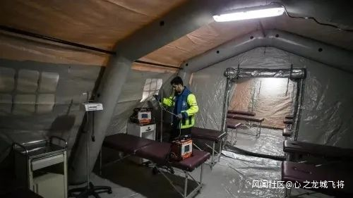 這種用充氣帳篷臨時搭設而成“方艙醫院”,一天之內就能搭設完畢,在帳篷內引入各種治療設備後,這些臨時醫院便可交付使用。帳篷內具備一定的保温功能,內部還設有用電插座,一般一個帳篷內可以容納4個病人同時隔離,醫護人員出入帳篷前都會進行消毒工作。