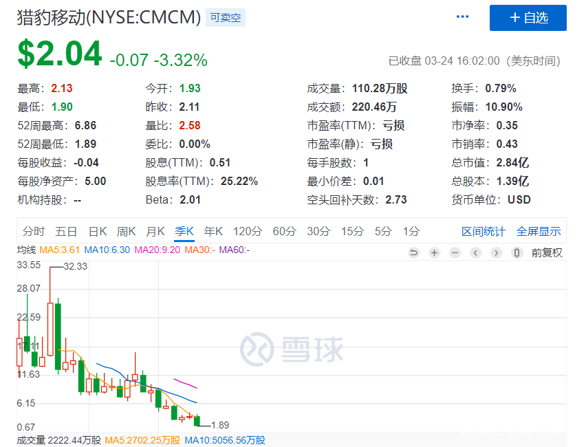 資本市場上自2019年至今,獵豹移動的股價再度縮水64%,市值蒸發5億美元。目前僅為2.84億美元,距離其最高市值逾50億美元,已經跌去94%。