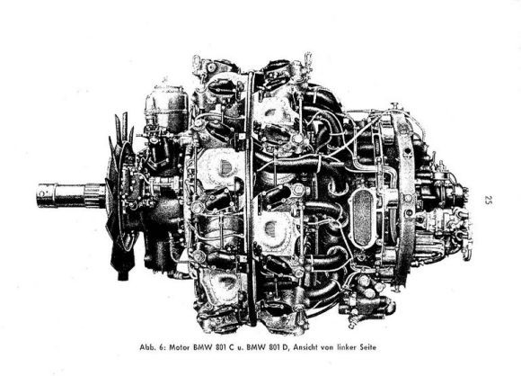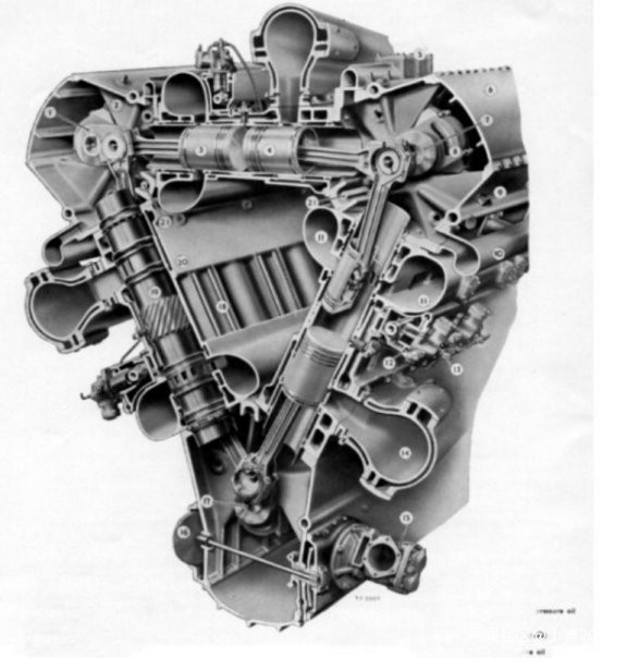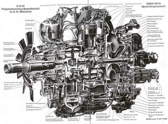 BMW801發動機。發動機內部的曲軸和變速器輸出傳動軸在一條直線上。後面的那根傳動軸則是機械增壓器傳動軸了。這樣的佈局,當然沒有空間給軸炮了。