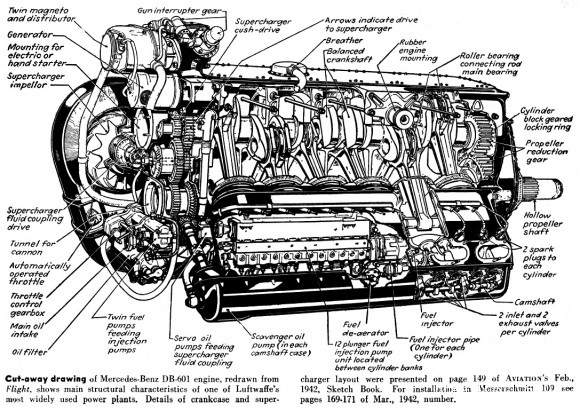 DB601倒V液冷活塞發動機。曲軸在發動機頂部。變速器在發動機前部,後部齒輪組則是機械增壓器進氣裝置帶動齒輪。傳動軸則是在發動機中間部分。