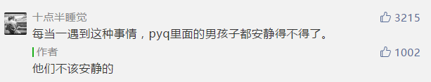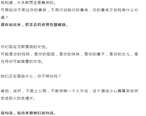 哦,想説的是大多數男孩子,沒有為女孩子發聲。沒有在朋友圈和微博裏刷屏,沒有舉着牌子站到大街上去進行一場wakeup運動。哦,用我這種”人至賤則無敵“的小人來看,沒有轉發這篇文章,也是沒有為女性發聲的一種吧。