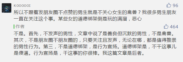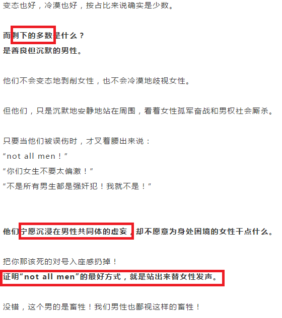我實在不能夠理解,這種文章風格的作者,前一句寫“善良的男性”,下一句寫“他們寧願沉浸在男性共同體的虛妄,也不為身處困境的女性乾點什麼的”。這兩者之間是怎麼對應起來的。