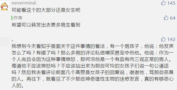 任何社會都有壞人,但是在打擊他們的時候,不能讓無辜的普通人躺槍。中國的很多男生,觀念傳統,思想保守,本來就缺乏男女共處的機會和交流,缺乏溝通、理解和共情的能力。公知們急着把他們推向女性羣體的對立面,是要怎麼樣呢?