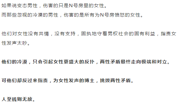 但我只有一個感覺,怎麼樣保護身邊的女性最有用我不知道。但是我知道宣揚和煽動仇恨、對立情緒肯定沒有用。有的人認為,“不發聲”就是在為犯罪做幫兇。反倒是我覺得,相比於某些大言不慚地表示“我批評個電冰箱還要學會自己製冷嗎?”的個人和公知,少做壞事,多做好事要實際得多。