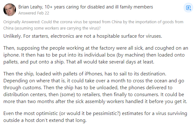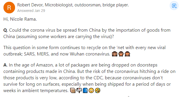 這個問題以某種形式繼續在網絡上循環,每一次新的病毒爆發都會有人問一次,SARS,MERS,現在新冠病毒。���