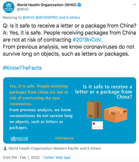 世衞專家:不會。我們的研究表明,病毒無法在物體表面存活太長時間。所以接收跨國快遞不會感染新冠病毒。