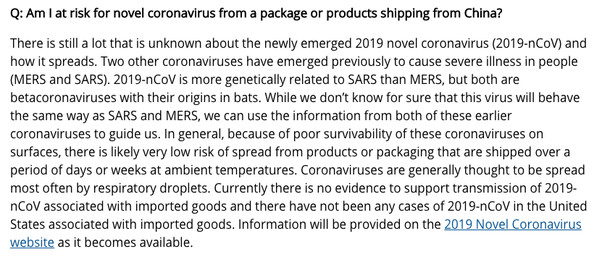 記者:有人問,接收從武漢或中國來的包裹會有感染新冠病毒的風險嗎?