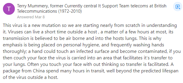 這種病毒是一種新的變異,所以我們幾乎是從零開始瞭解它。病毒可以在宿主外部存活很短時間,最多幾個小時,其傳播路徑被認為是空氣傳播並進入宿主肺部。這就是為什麼人們把重點放在個人衞生上,並且經常徹底洗手;手可能接觸到受感染的表面而被污染,如果你躺在沙發上,病毒就會被攜帶到一個有助於病毒轉移到肺部的區域。你經常用不經意的方式觸摸自己的臉,這樣轉移就容易了。一個來自中國的包裹在運輸途中花費了很多小時,遠遠超過了病毒在宿主之外的預期壽命。