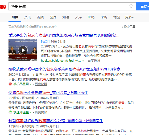 新冠病毒流行期間,收包裹會不會感染病毒,這個問題也是很多人關心的。上百度搜一下“包裹 病毒”可以搜出很多相關的問題。