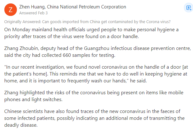 問:新冠病毒能通過從中國進口貨物傳播嗎(假設有些工人攜帶這種病毒)?