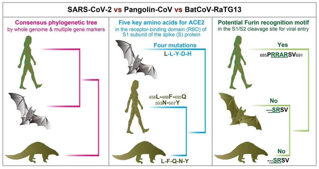研究發現,穿山甲冠狀病毒與新冠病毒的親緣關係僅次於蝙蝠冠狀病毒,但是穿山甲冠狀病毒與新冠病毒的S1功能基序高度一致,涉及與人類ACE2受體互作的五個關鍵氨基酸殘基完全一致,而蝙蝠冠狀病毒發生了四個突變,提示了穿山甲冠狀病毒與新冠病毒具有相似的宿主細胞識別能力。研究還發現在S1/S2酶切位點,新冠病毒含有中東呼吸綜合徵冠狀病毒類似的Furin蛋白識別序列,而穿山甲冠狀病毒、蝙蝠冠狀病毒以及SARS冠狀病毒都缺失了該功能基序,表明新冠病毒與中東呼吸綜合徵冠狀病毒具有相似的宿主細胞侵入機制。