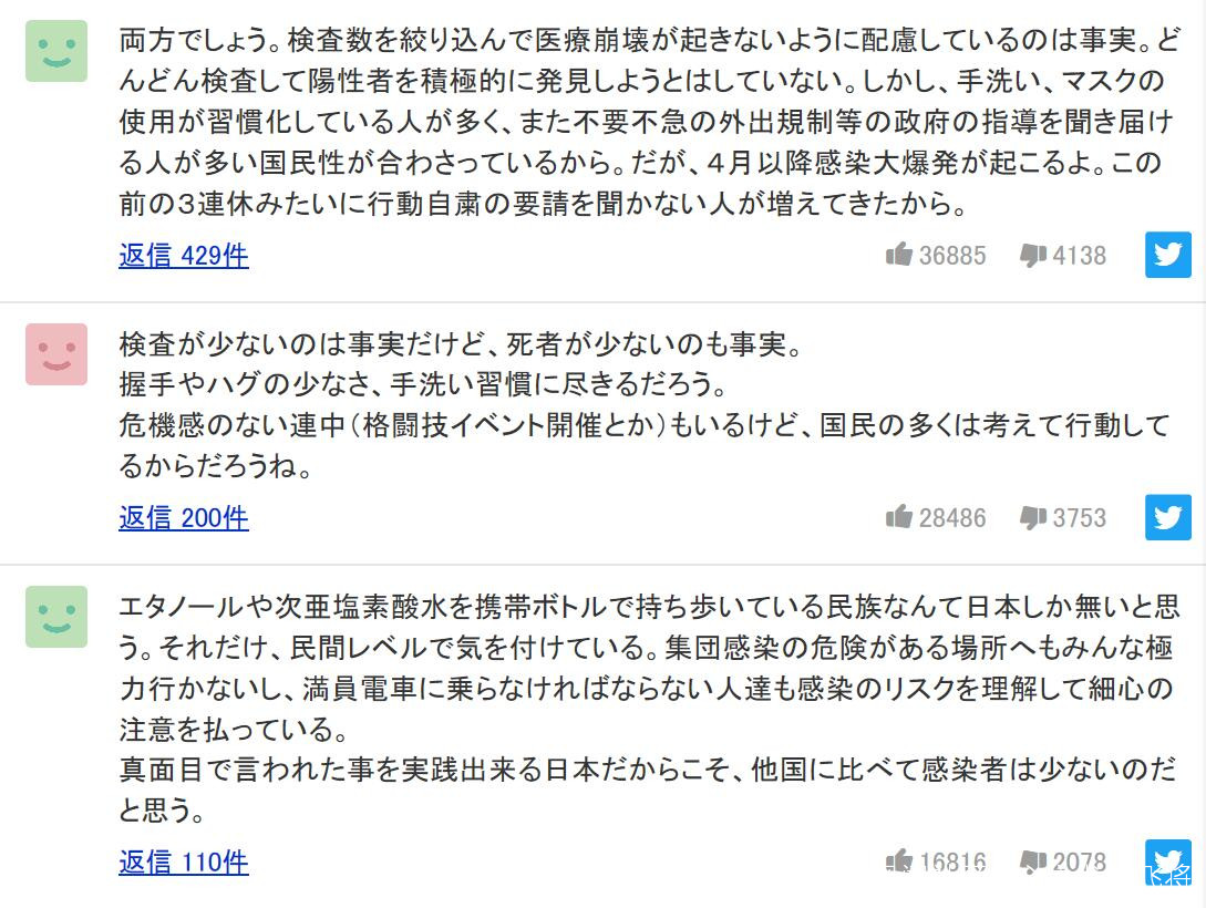 對於歐美媒體的質疑,不少日本網友也紛紛給出了自己的解釋。不少人在承認日本檢測數據較少的同時,也指出:“即便沒有疫情,很多日本人也都把勤洗手、戴口罩作為日常生活習慣,很多人都會認真聽取政府限制外出的建議,這都符合日本人的國民性” ;“檢測數據少是事實,但是死亡人數少也是事實”。
