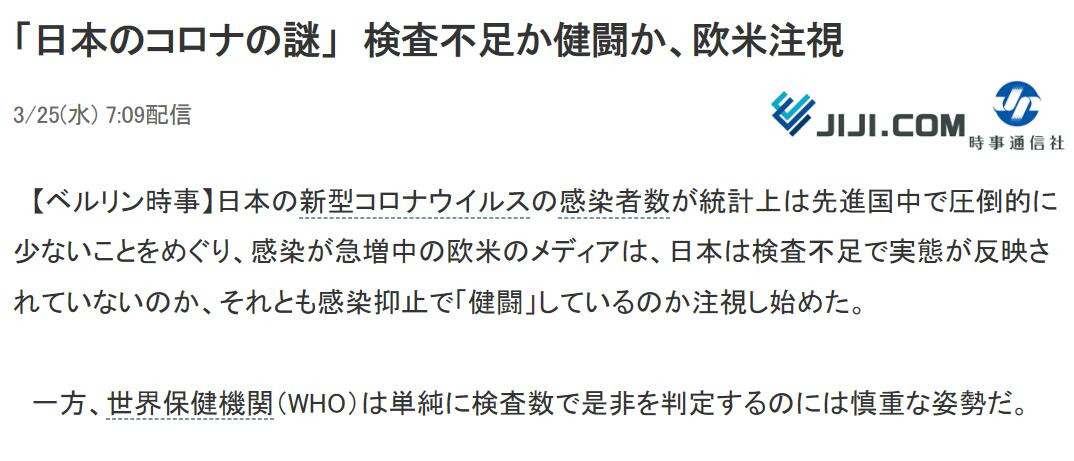 【海外網3月25日|戰疫全時區】 據日本時事通訊社25日報道,在全球發達國家中,日本因新冠病毒確診人數相對較少而備受關注。對此,不少歐美媒體紛紛提出質疑,稱日本是因為檢測數量不足或人為進行干預,而沒有反應實際情況,那麼事實到底是怎麼回事呢?