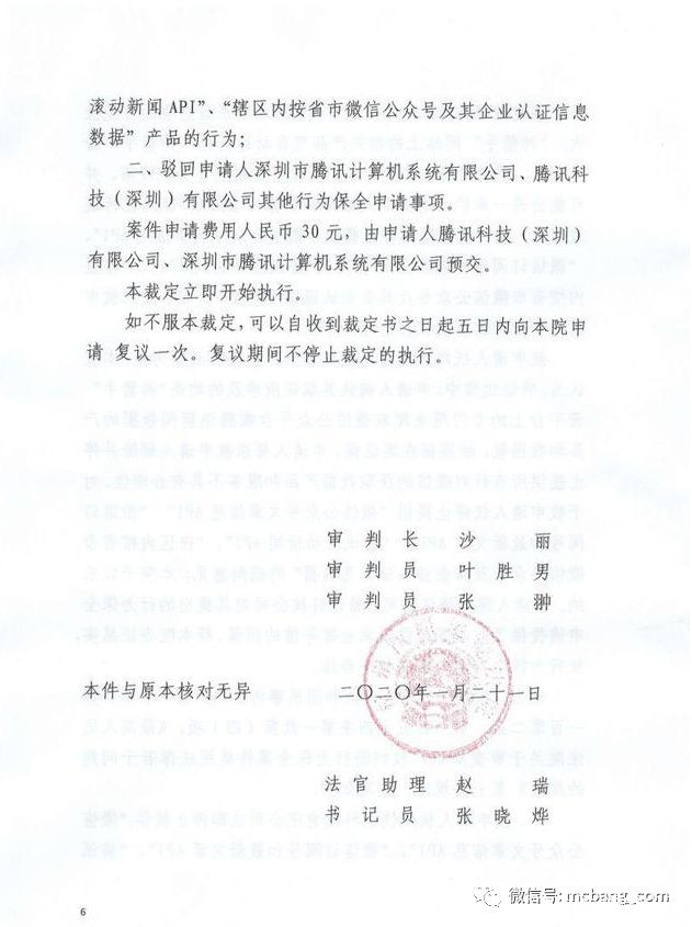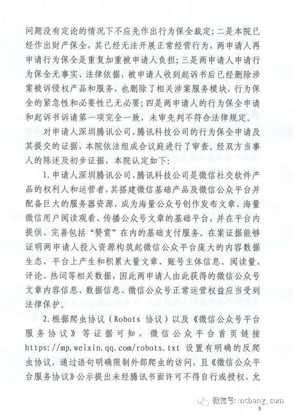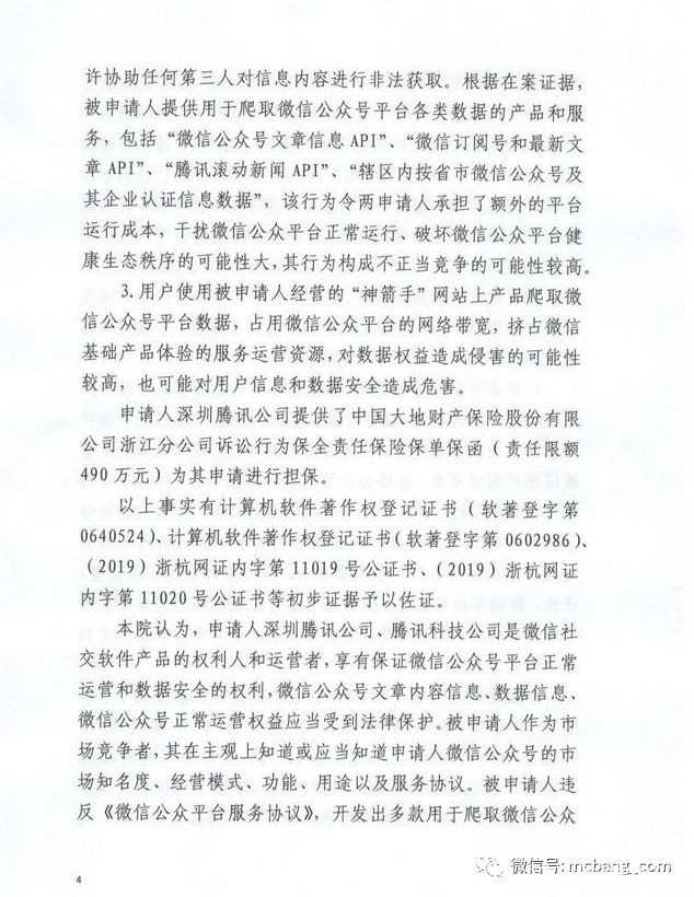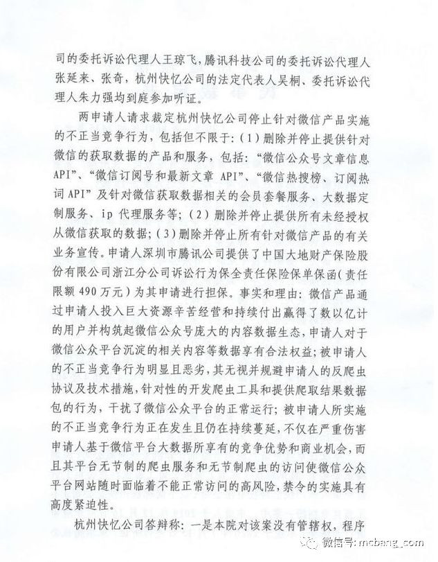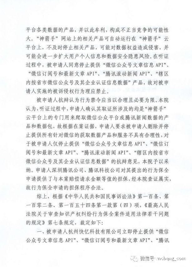 近日,杭州鐵路運輸法院就騰訊公司提出的申請作出裁定,認為杭州快憶科技有限公司違反《微信公眾平台服務協議》,開發出多款用於爬取微信公眾平台各類數據的產品並以此牟利的行為,構成不正當競爭的可能性大,杭州快憶需立即停止被訴侵權行為,目前,該網站涉案的相關產品及服務已下架。