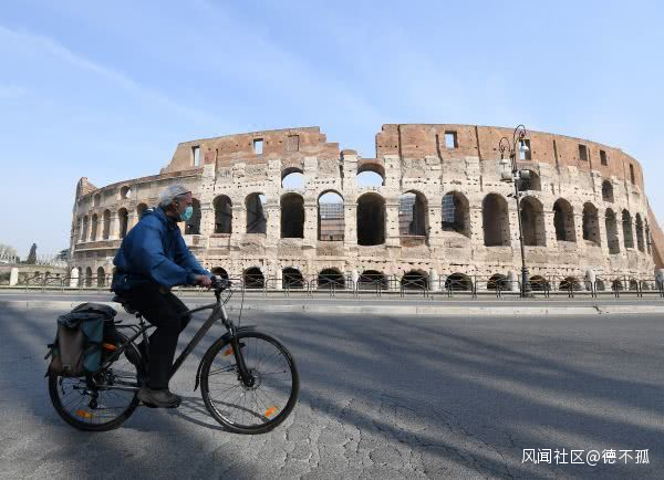 3月22日,戴着口罩的男子騎車經過羅馬鬥獸場。(埃莉薩·林格里亞 攝)