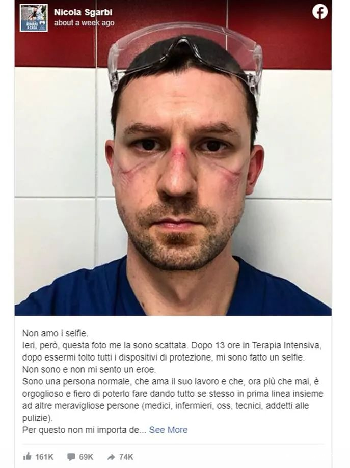 近日,一張意大利一位醫生被口罩勒得滿臉是血痕的圖片,就在意大利的網絡上獲得了16萬的超高點贊。