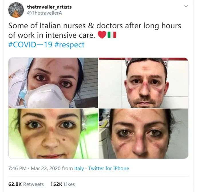 與此同時,另一組發佈在境外社交媒體推特上的意大利醫生被口罩勒得滿臉淤青的照片,目前也獲得了來自世界各地網民送來的15萬的點贊。